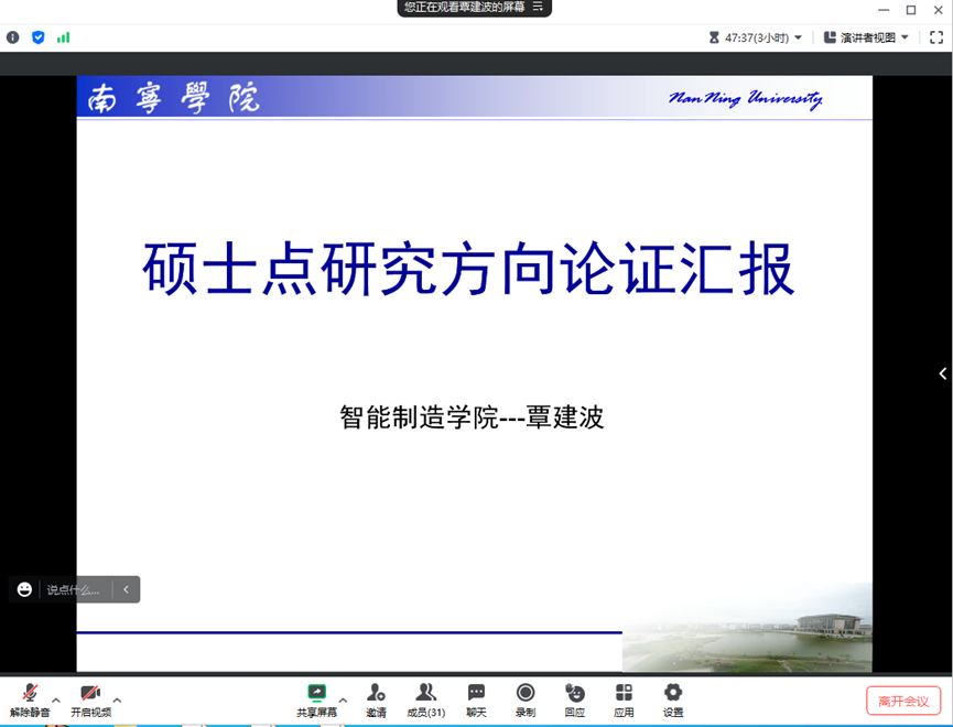 8月23日,通过腾讯会议以线上形式召开了“电子信息”硕士培育点研究方向的论证报告会。参加论证会的人员有参与电子信息硕士培育点的全体成员,包括智能制造学院、信息工程学院和人工智能与软件学院的二十一名老师以及科研秘书;此外,特别邀请了李啸璁、李建教授、来自广西大学的柔性引进专家团队,包括梁家荣、陈海强教授、胡立坤教授及广西“先进测控与智能电力研究中心”团队成员殷林飞等五名教师。