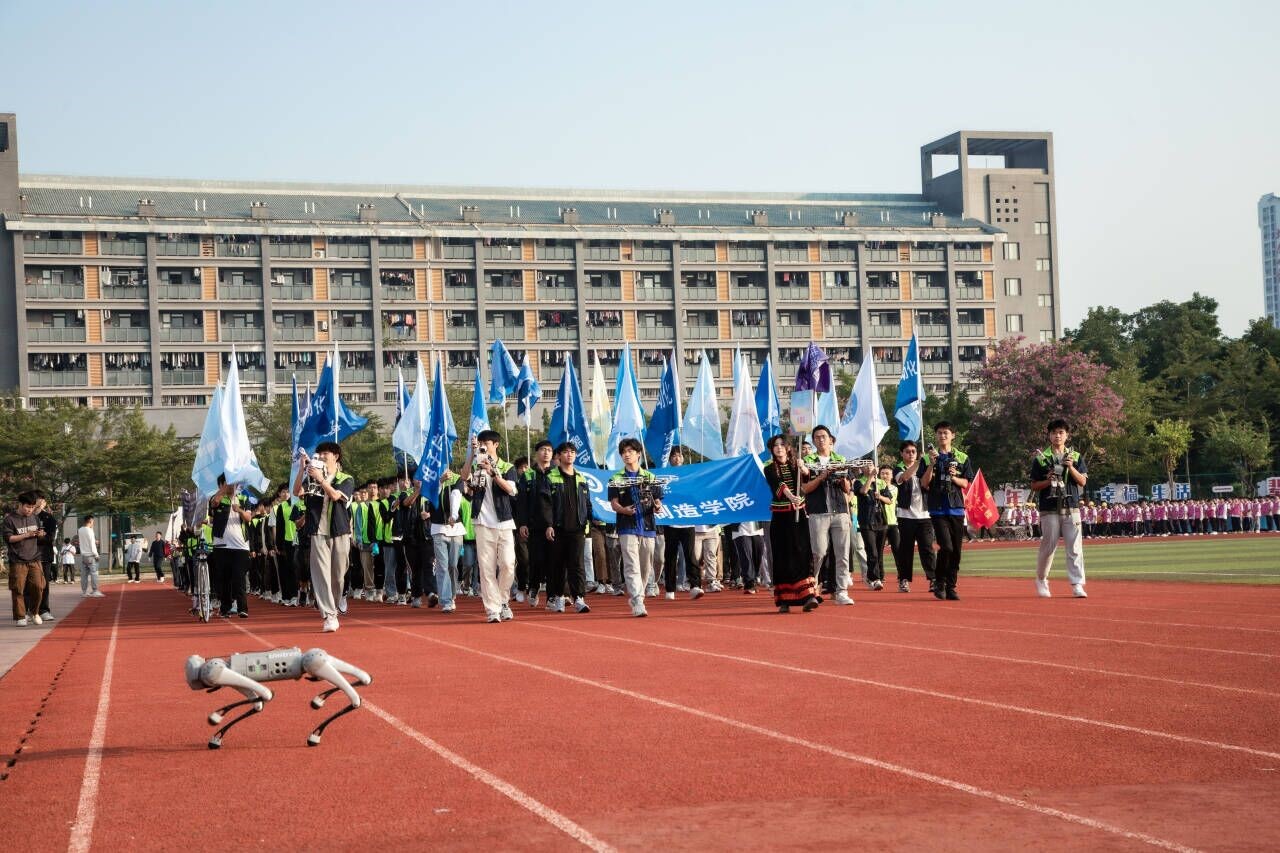 11月24日上午,在开幕式中,学院方块队伍身着学院实训的“实训服”和荧光绿的马甲,举着学院代表队在全国赛事上获奖的荣誉奖牌,在专业特色机械狗和自动单车的带领下,方块队以饱满的热情,昂首挺胸,整齐划一的步伐的走过主席台,为全校师生呈现出一场别开生面的展示,赢得现场观众的阵阵掌声。