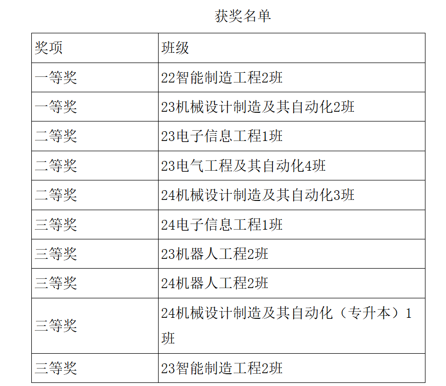 经评委组综合评审,最终确定获奖名单:22智能制造工程2班、23机械设计制造及其自动化2班荣获一等奖;3个班级获二等奖;5个班级获三等奖。所有获奖班级在学风营造、班级管理、特色活动开展等方面均表现优异,为全院班级树立了良好典范。