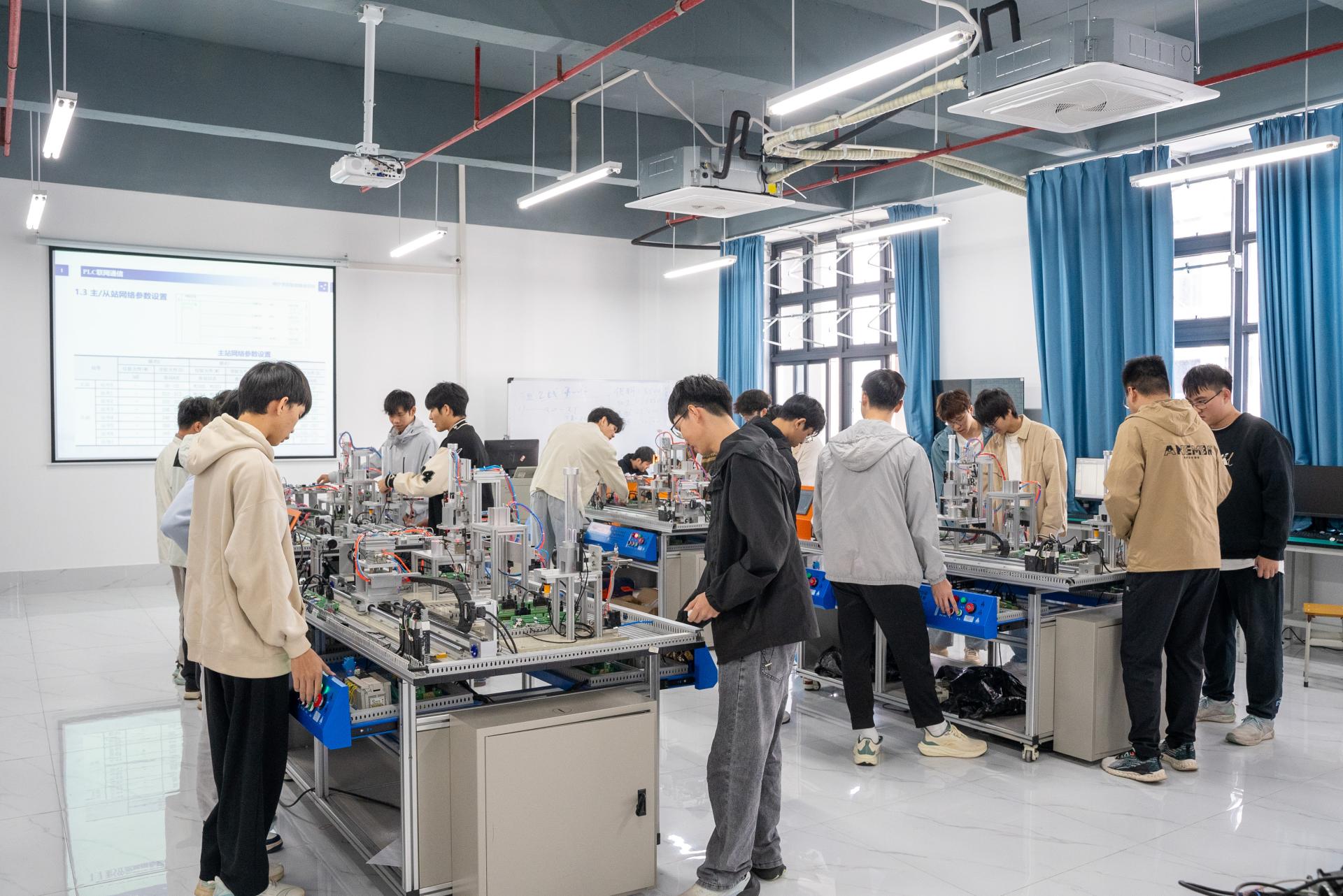 自动线安装与调试实训室是面向智能制造学院电气工程及其自动化、机械设计制造及其自动化、机器人工程、智能制造工程专业学生,提供专业实践学习、技能训练、项目开发及创新能力培养的实践教学平台。本实训室占地144平方米,配备专业的软硬件环境,通过模拟工业流水线项目场景,帮助学生将理论知识转化为实践能力,掌握工业制造业主流技术和工具,提升解决复杂工程问题的能力,培养团队协作精神和创新意识。