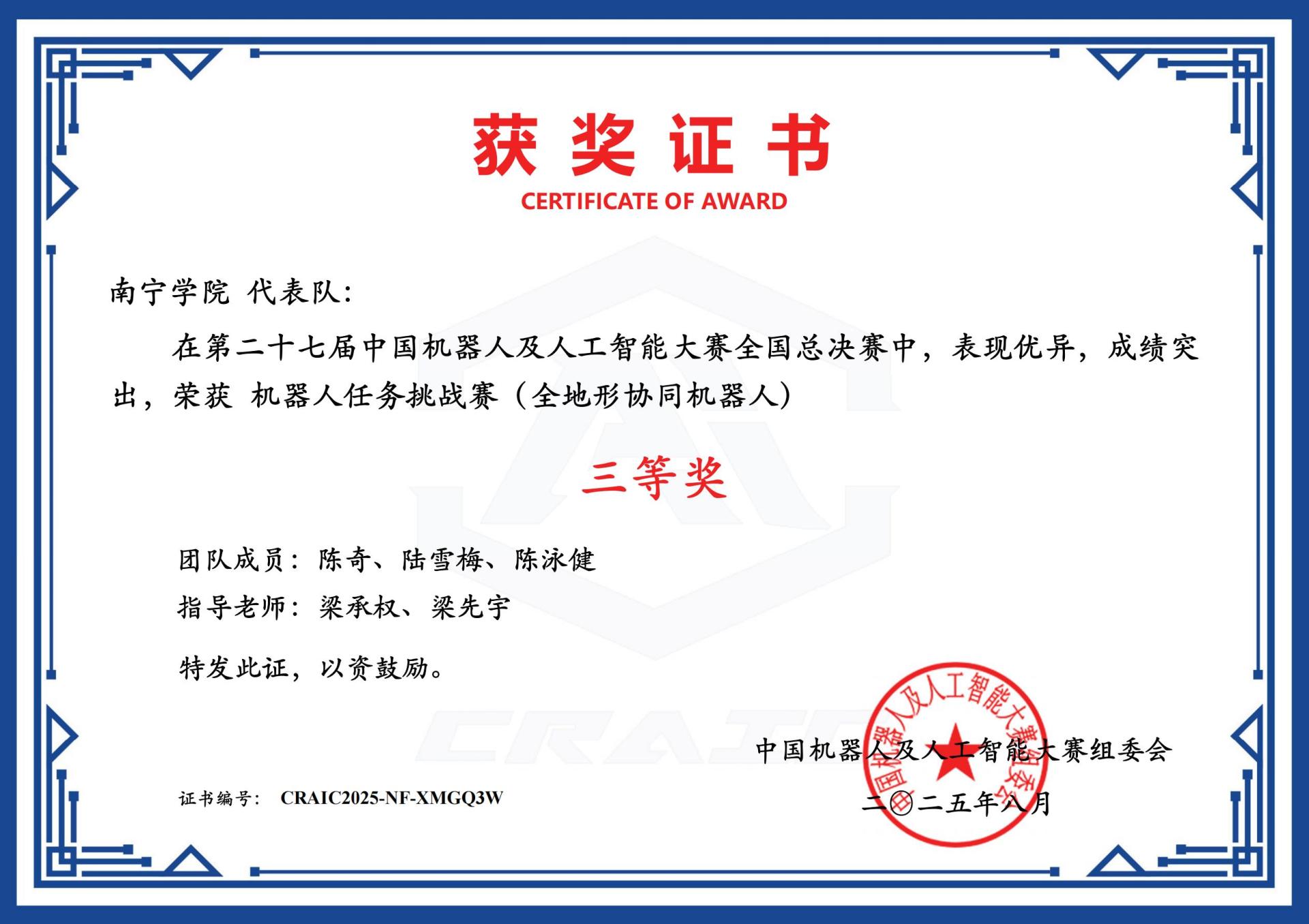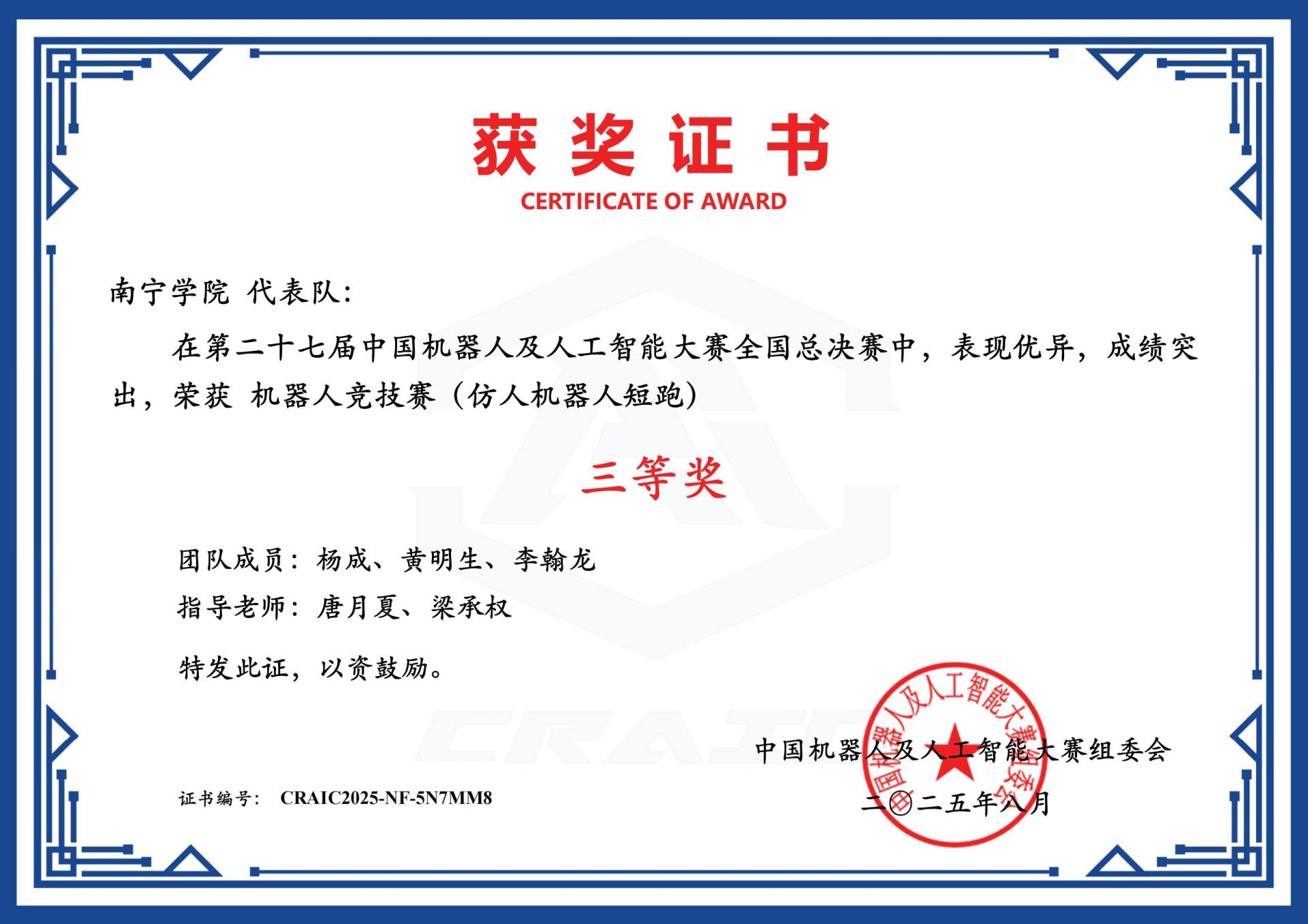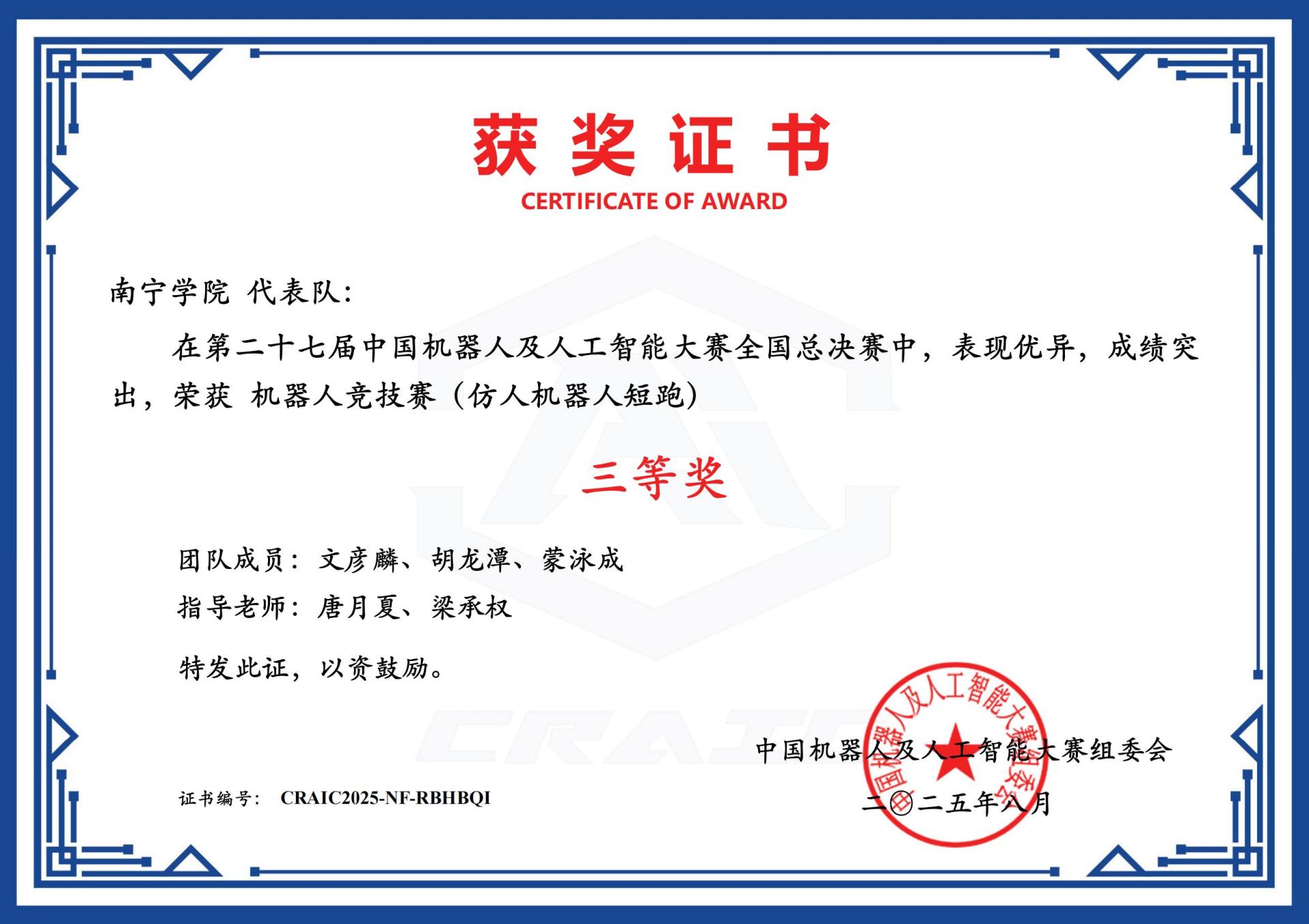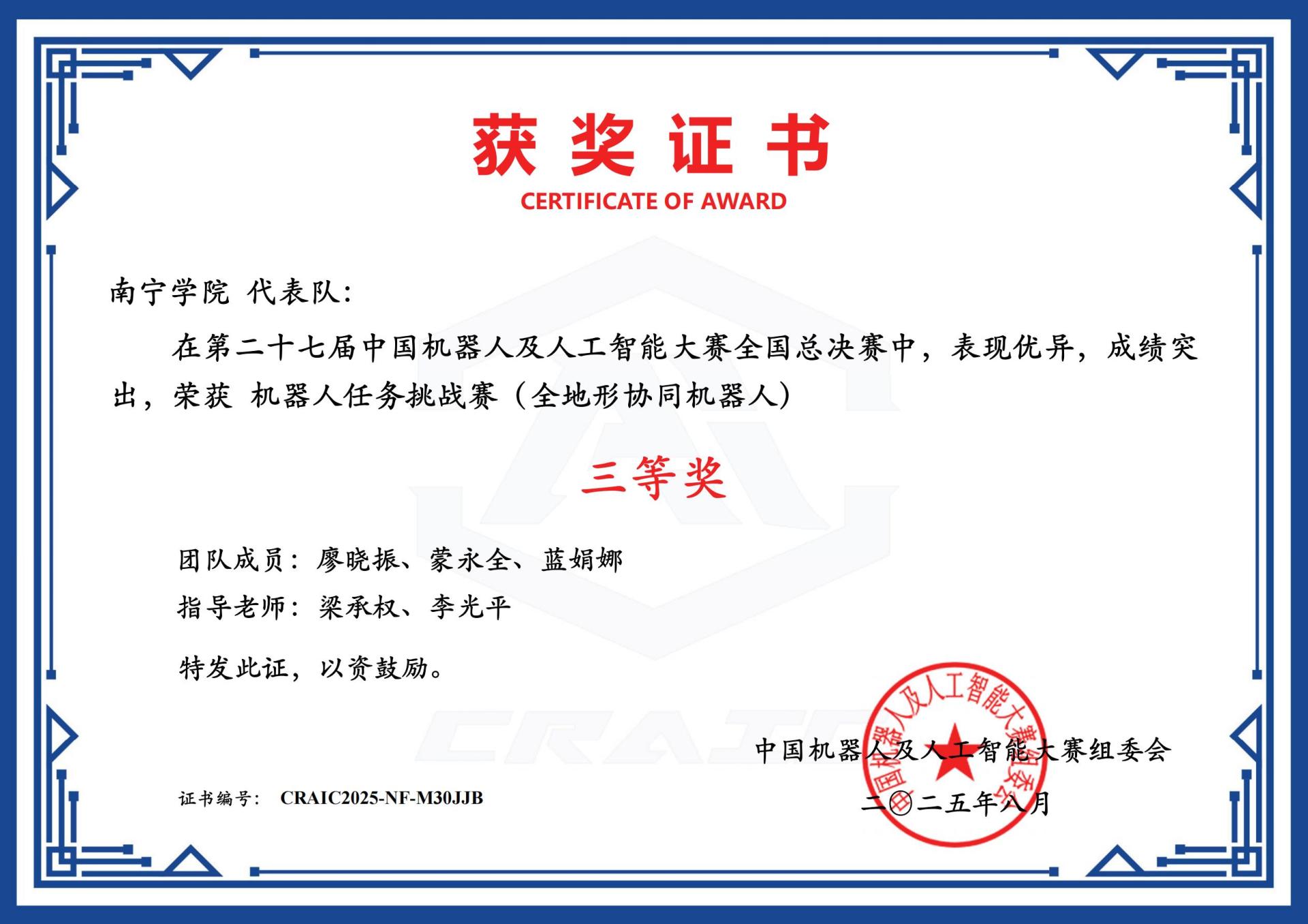 第二十七届中国机器人及人工智能大赛全国总决赛证书